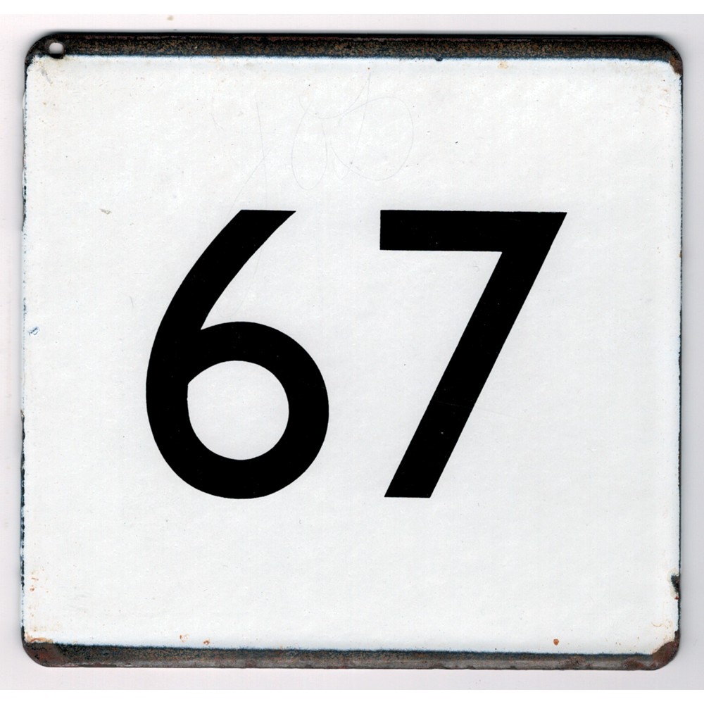 A London Transport enamel bus stop 'e' plate for Route 67. From January 1950 until 1958 route 67 ra..