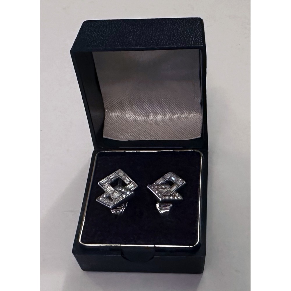 This is a pair of rectangle-design silver clip-on earrings with original box.