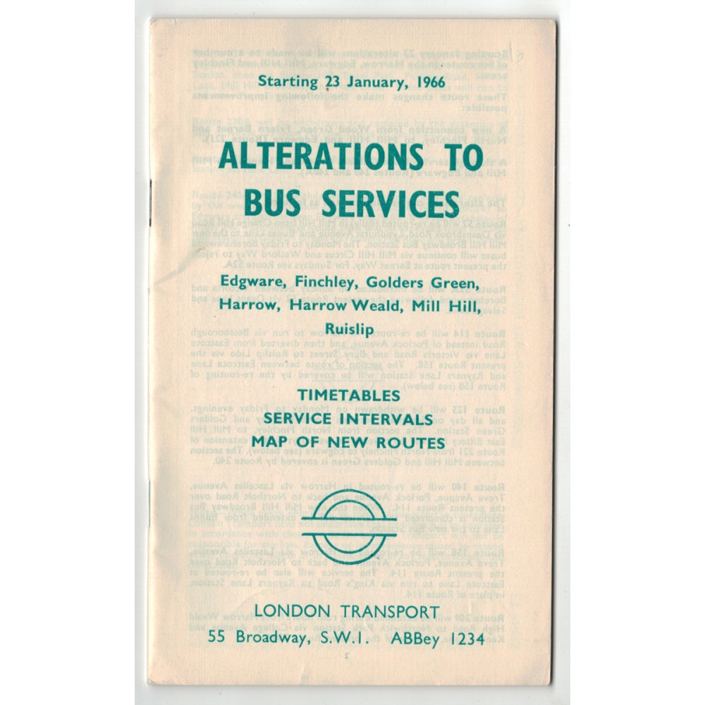 This is a London Transport 'Alterations to Bus Services' booklet for changes starting on 23rd January 1966 in the Edgware, Finchley, Golders Green, Harrow, Harrow Weald, Mill Hill and Ruislip areas. The print reference is 1165/3652C/10,500.