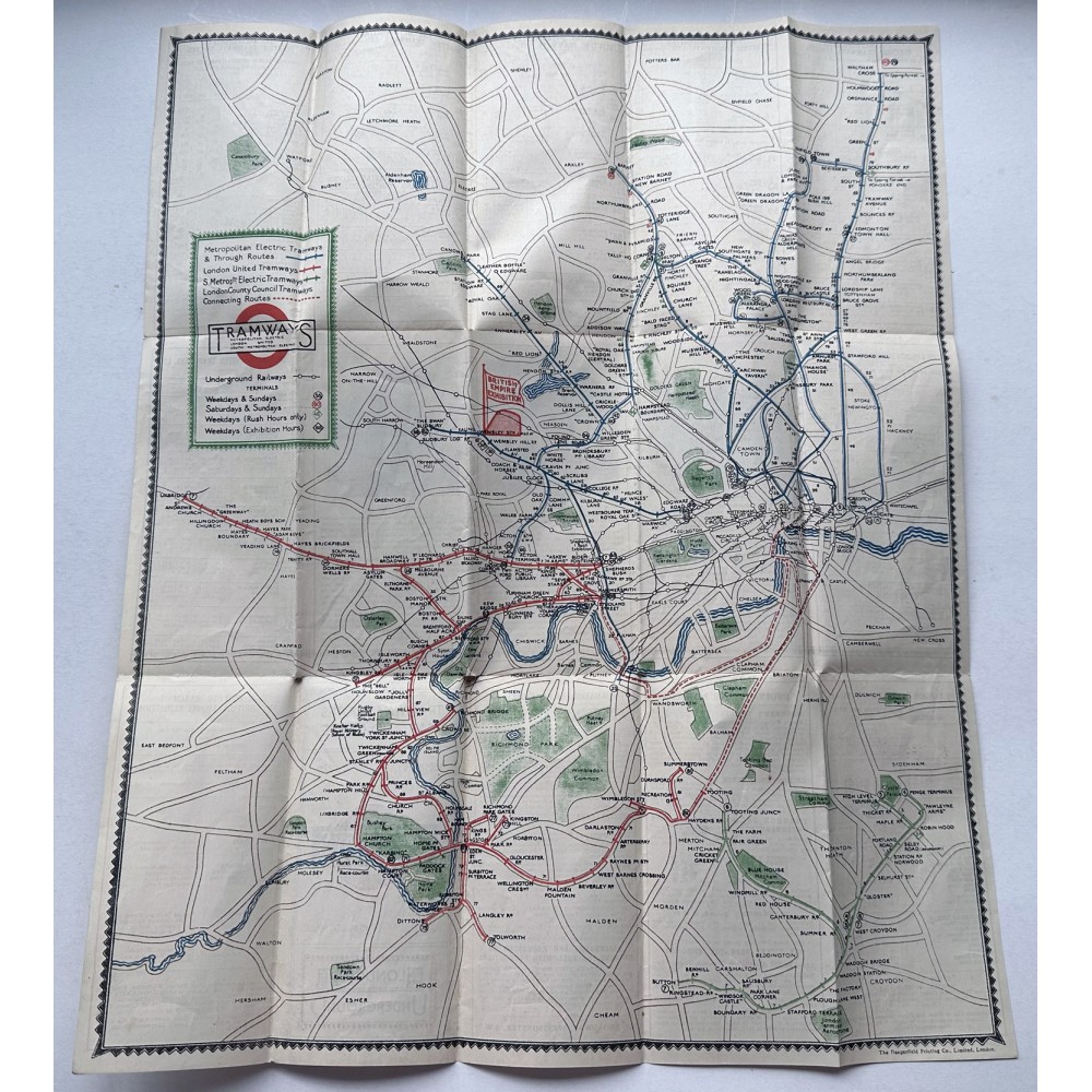 It is 76mm wide x 150mm deep and the map folds out to approximately 380mm wide x 450mm deep and shows the tramway routes of Metropolitan Electric, London United and South Metropolitan Electric on one side, and a list of routes on the other side with through running times and fares.