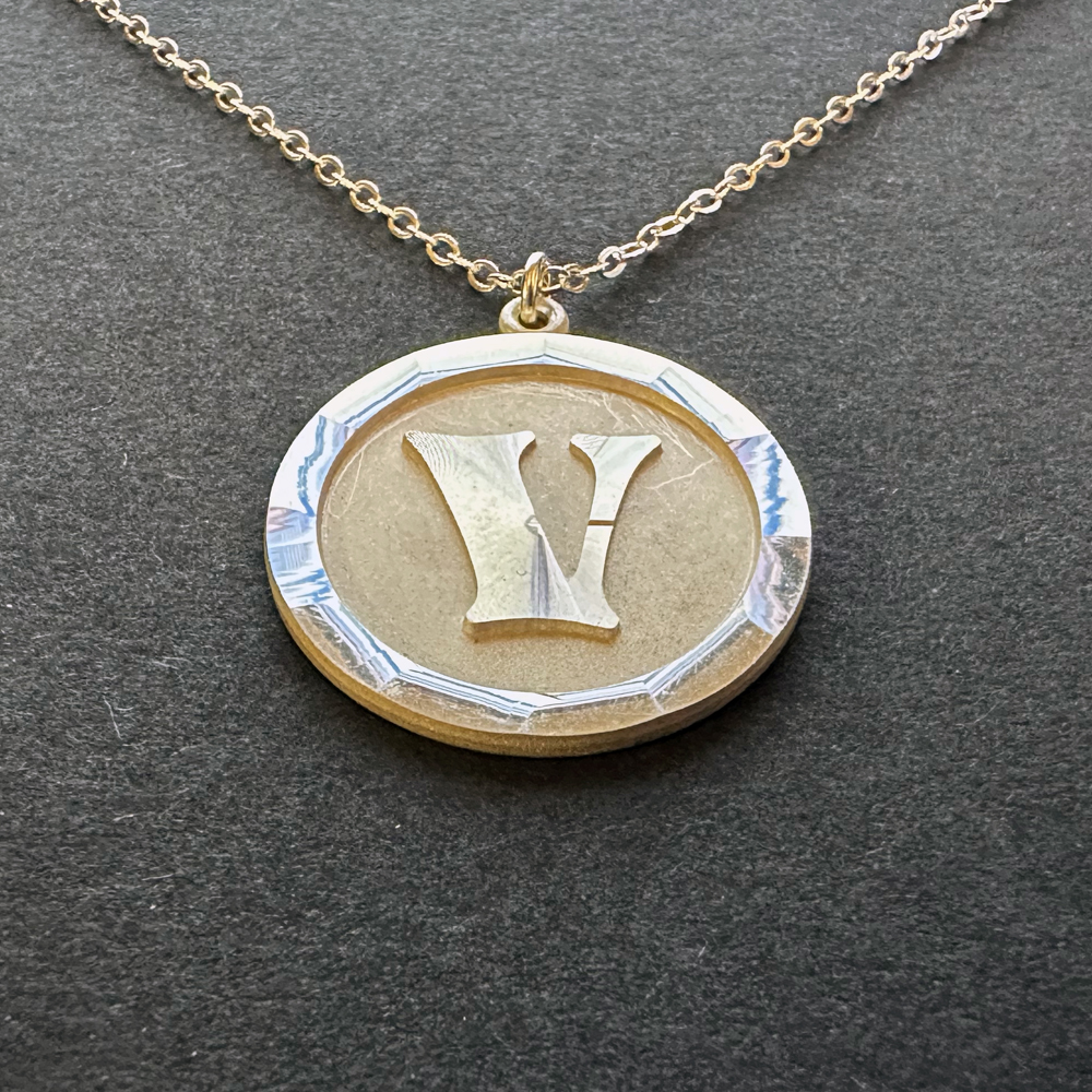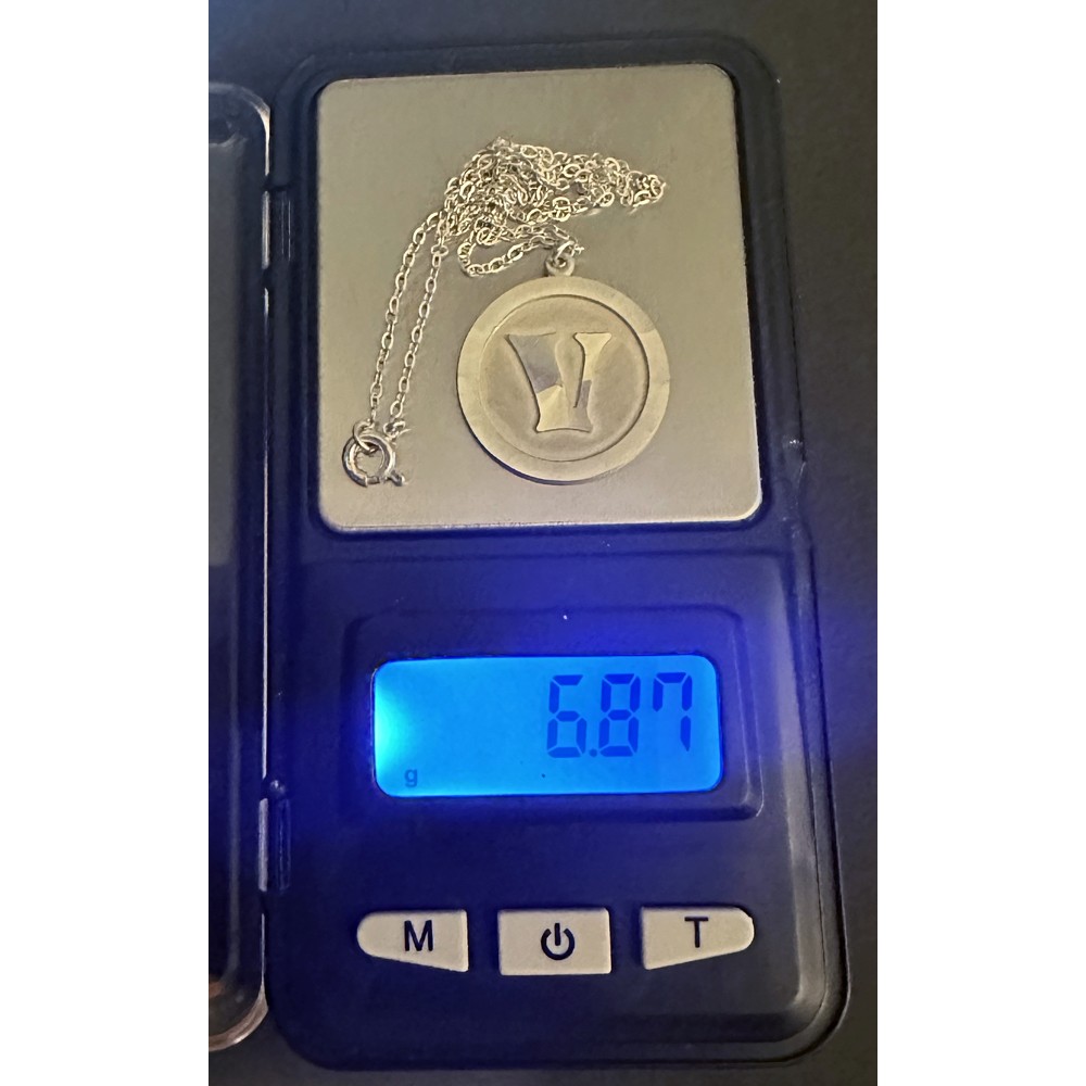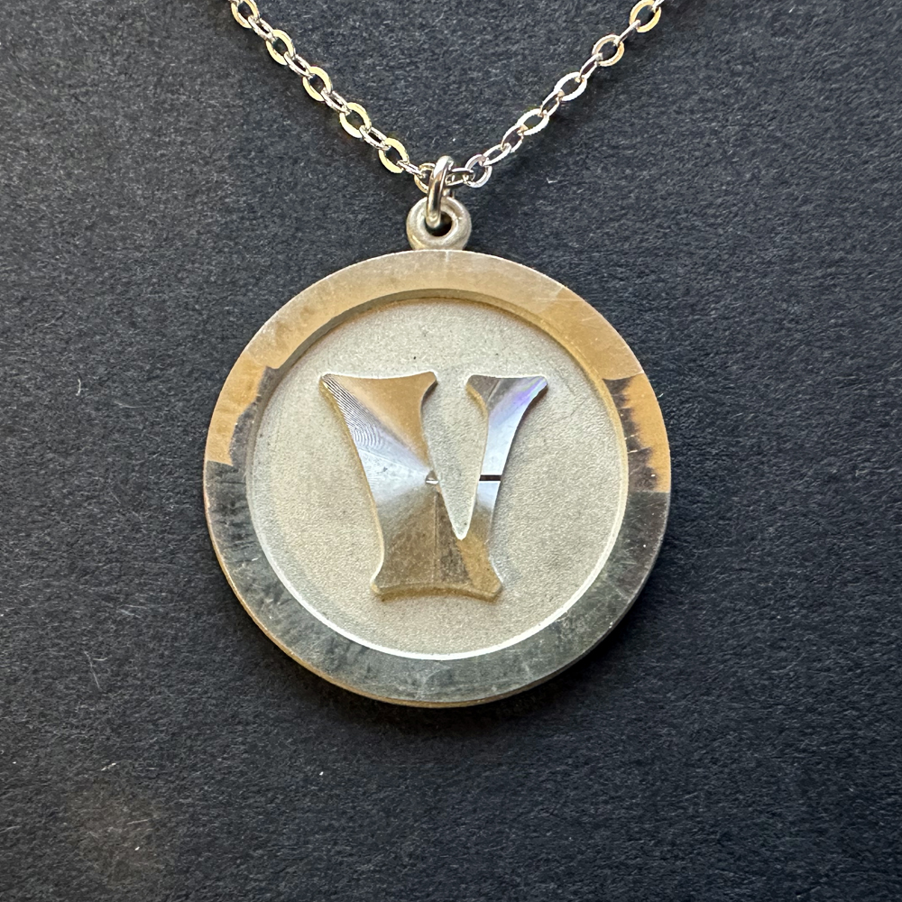 This is a Silver Pendant with initial letter 'V' on a fine 46cm (18 inch) silver-coloured chain. The pendant is 25mm diameter and marked 'silver' on the reverse. Total weight including chain is 6.87g.