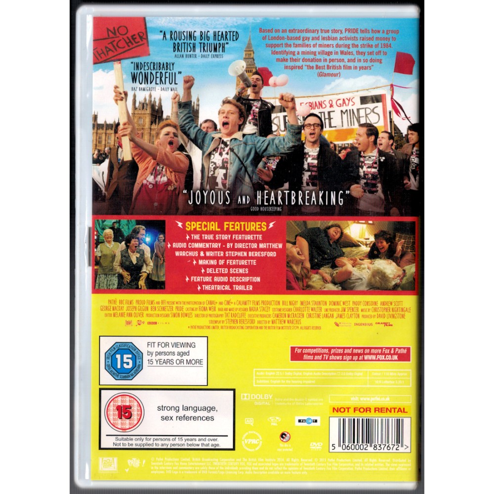 Based on an extraordinary true story, PRIDE tells how a group of London-based gay and lesbian activists raised money to support the families of miners during the strike of 1984. Identifying a mining village in Wales, they set off t make their donation in person, and in so doing inspired "The Best British film n years" (Glamour)
